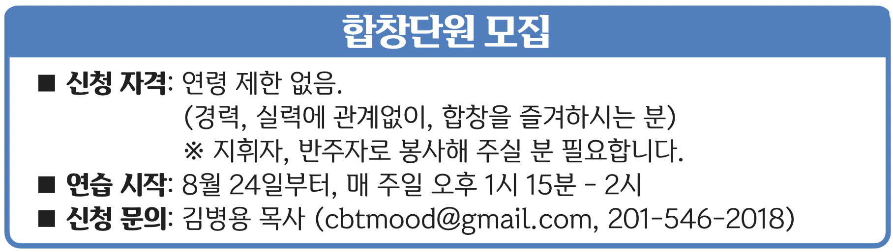합창단원 모집 ◼ 신청 자격: 연령 제한 없음. (경력, 실력에 관계없이, 합창을 즐겨하시는 분) ※ 지휘자, 반주자로 봉사해 주실 분 필요합니다. ◼ 연습 시작: 8월 24일부터, 매 주일 오후 1시 15분 - 2시 ◼ 신청 문의: 김병용 목사 (cbtmood@gmail.com, 201-546-2018)